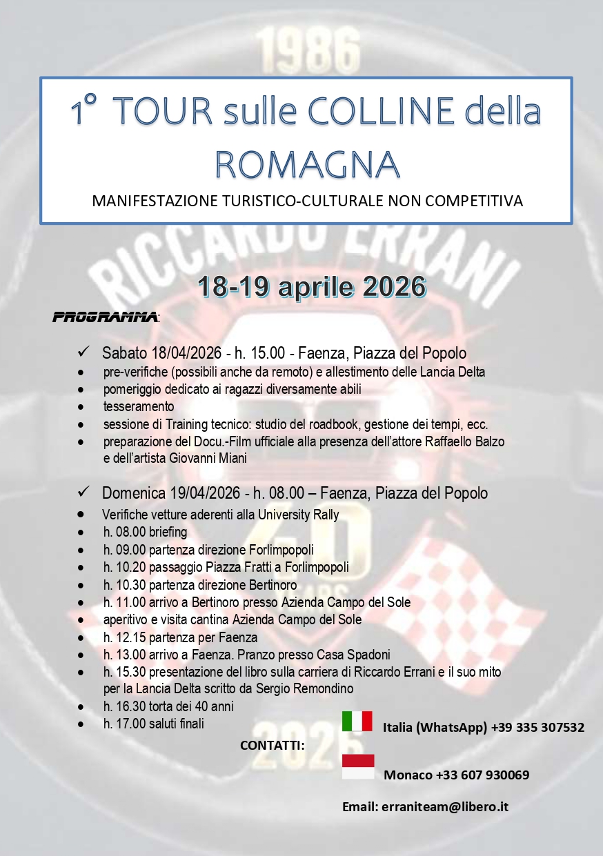 Fondato da Riccardo Errani nel 1989, l’Errani Team Faenza ha saputo ben presto ritagliarsi uno spazio importante nel panorama del rally internazionale e nazionale. Legato in maniera quasi inscindibile al marchio Lancia, con Errani alfiere di tutte le evoluzioni della Delta, il team faentino è stato da prima protagonista in Europa agli inizi degli anni ’90 grazie alle prestigiose gare automobilistiche di Mitropa Cup rally di Riccardo Errani, per ben due volte vice campione europeo fra i piloti privati. |